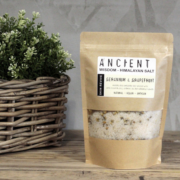 Mineral, rich Himalayan salt infused with 100% essential oils, Vitamin E Oil and Chamomile Flowers.